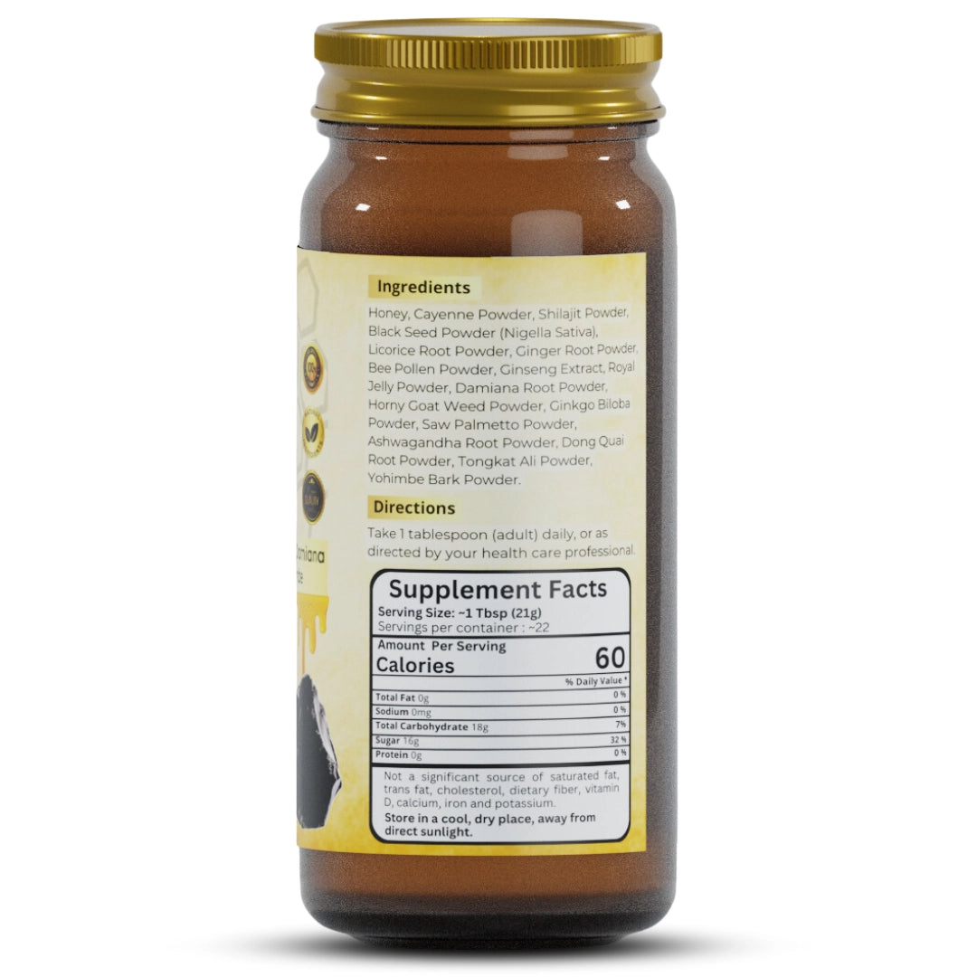 Handcrafted and made in the USA, our pure Shilajit Multifloral Honey combines the potent essence of Shilajit Extract with a unique mixture of revitalizing herbs, including Tongkat Ali, Horny Goat Weed, Damiana, Ashwagandha, and Yohimbe. Harvested from Himalayan mountain with unique adaptogenic properties, Shilajit promotes overall balance and vitality.